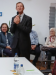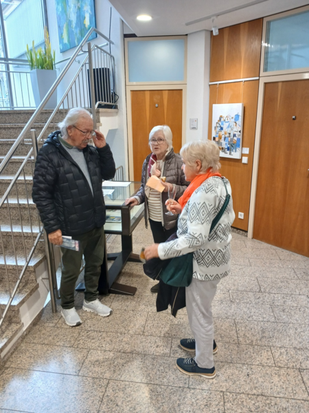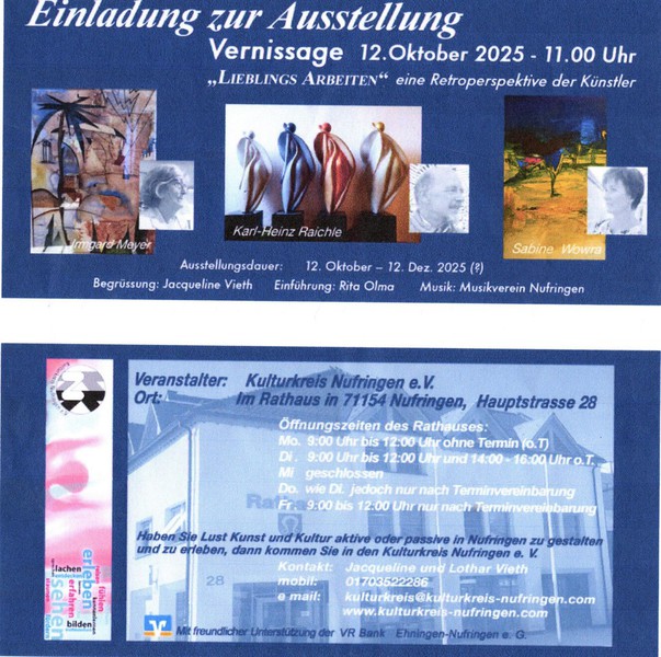 Danach bedankte sich J. Vieth bei den Künstler*innen und den Vortragenden mit Blumensträußen und Geschenken, bei den Sponsoren wie der VR Bank Ehningen-Nufringen e.G., der Gemeindeverwaltung und beim Helferteam. Sie verwies noch auf die Ausgabe der bereitgestellten kostenlosen Getränke samt Hefezopf. Die Werke können käuflich erworben werden (direkt bei den Künstler*innen, Preisliste liegt aus). Die Ausstellung ist zu den üblichen Öffnungszeiten des Nufringer Rathauses bis zum 12.12.2025 zu besichtigen.
